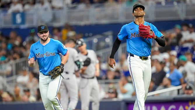 Edward Cabrera of the Miami Marlins walks to the dugout after getting the out at first as teammate Liam Hicks watches on during the sixth inning against the New York Yankees on Sunday. (Photo by Jared Lennon/Getty Images)