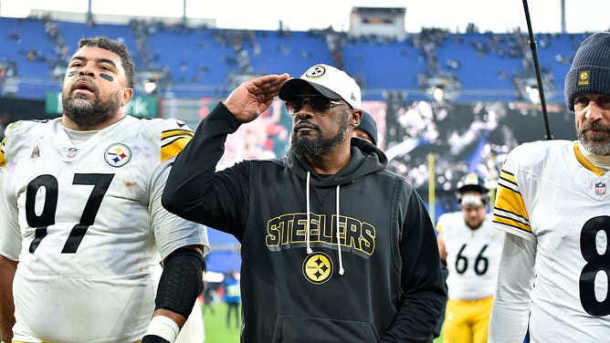 BALTIMORE, MD - DECEMBER 07: Steelers head coach Mike Tomlin salutes to Steelers fans in the stands while walking off the field with defensive tackle Cameron Heyward (97) and quarterback Aaron Rodgers (8) during the Pittsburgh Steelers versus Baltimore Ravens NFL game at M&T Bank Stadium on December 7, 2025 in Baltimore, MD. (Photo by Randy Litzinger/Icon Sportswire via Getty Images)