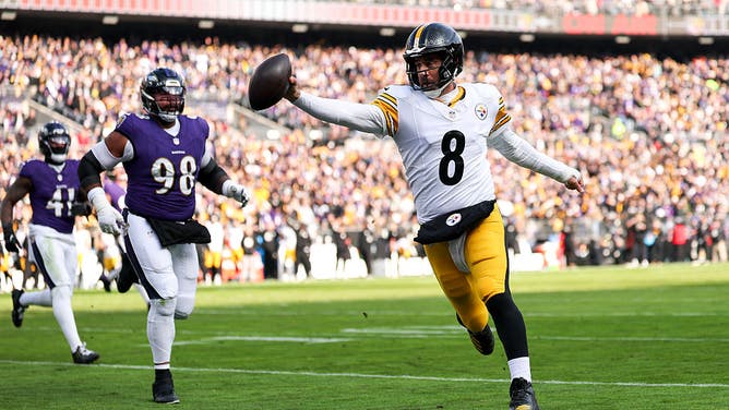 BALTIMORE, MARYLAND - DECEMBER 07: Aaron Rodgers #8 of the Pittsburgh Steelers rushes for a touchdown during the first quarter against the Baltimore Ravens at M&T Bank Stadium on December 07, 2025 in Baltimore, Maryland. (Photo by Scott Taetsch/Getty Images)