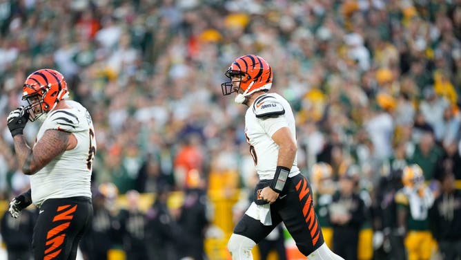 Oct 12, 2025; Green Bay, Wisconsin, USA; Cincinnati Bengals quarterback Joe Flacco (16) reacts after a successful two point conversion in the fourth quarter against the Green Bay Packers at Lambeau Field. Mandatory Credit: Jeff Hanisch-Imagn Images