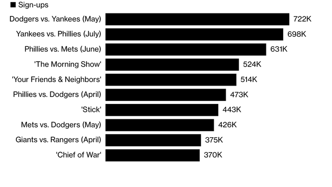 Citing data from Antenna, Bloomberg News reported that a May game between the Los Angeles Dodgers and New York Yankees led more people to sign up for the service than any other program from April 2025 through September 2025, generating 722,000 new accounts.