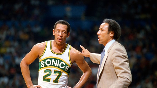 SEATTLE, WA - CIRCA 1982: Head coach Lenny Wilkens of the Seattle Supersonics talks with player John Johnson #27 while there's a break in the action during an NBA basketball game circa 1982 at King County Dome Stadium in Seattle, Washington. Wilkens coached for the Supersonics from 1969-72 and 1977-85. (Photo by Focus on Sport/Getty Images)