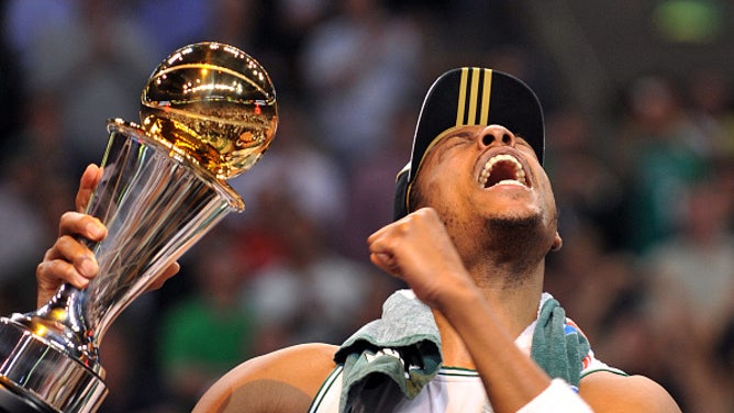 TOPSHOT - Boston Celtics' Paul Pierce celebrates with his MVP trophy after winning Game 6 of the 2008 NBA Finals in Boston, Massachusetts, June 17, 2008. The Boston Celtics captured the National Basketball Association championship, routing the Los Angeles Lakers 131-92 to win the best-of-seven NBA Finals four games to two. AFP PHOTO / GABRIEL BOUYS (Photo by GABRIEL BOUYS / AFP) (Photo by GABRIEL BOUYS/AFP via Getty Images)