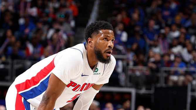 DETROIT, MI - APRIL 27: Malik Beasley #5 of the Detroit Pistons looks on during the game against the New York Knicks during Round 1 Game 4 of the 2025 NBA Playoffs on April 27, 2025 at Little Caesars Arena in Detroit, Michigan. (Photo by Brian Sevald/NBAE via Getty Images)