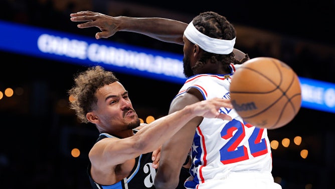 ATLANTA, GEORGIA - NOVEMBER 17: Trae Young #11 of the Atlanta Hawks passes around Patrick Beverley #22 of the Philadelphia 76ers during the second half during an NBA In-Season Tournament game at State Farm Arena on November 17, 2023 in Atlanta, Georgia. (Photo by Todd Kirkland/Getty Images)
