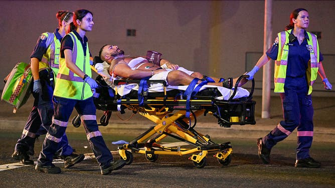 TOPSHOT - Health workers move a man on a stretcher to an ambulance after a shooting incident at Bondi Beach in Sydney on December 14, 2025. Australian police said two people were in custody following reports of multiple gunshots on December 14 at Sydney's famed Bondi Beach, urging the public to take shelter. (Photo by Saeed KHAN / AFP via Getty Images)