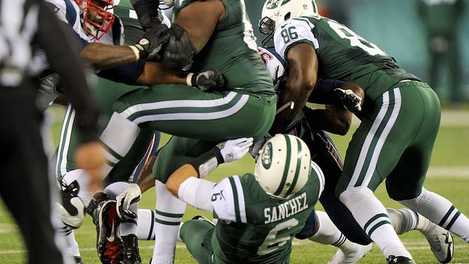 New York Jets quarterback Mark Sanchez #6 fumble in the first half when the New York Jets played the New England Patriots. Sanchez smacks into lineman Brandon Moore's rear end and fumbles, leading directly to New England TD, part of 35-point 2nd quarter for Patriots. (Photo By: Robert Sabo/NY Daily News via Getty Images)