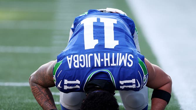 SEATTLE, WASHINGTON - NOVEMBER 30: Jaxon Smith-Njigba #11 of the Seattle Seahawks takes a moment prior to a game against the Minnesota Vikings at Lumen Field on November 30, 2025 in Seattle, Washington. (Photo by Steph Chambers/Getty Images)