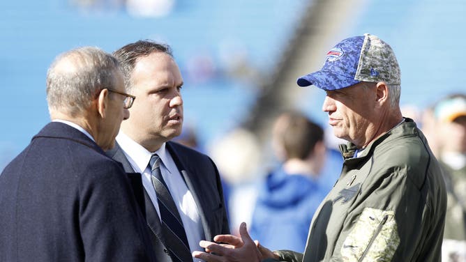 Nov 8, 2015; Orchard Park, NY, USA; Buffalo Bills head coach Rex Ryan (right) talks with Miami Dolphins owner Stephen M. Ross (left) and Mike Tannenbaum the Dolphins executive vice president of football operations before the game at Ralph Wilson Stadium. Mandatory Credit: Kevin Hoffman-USA TODAY Sports