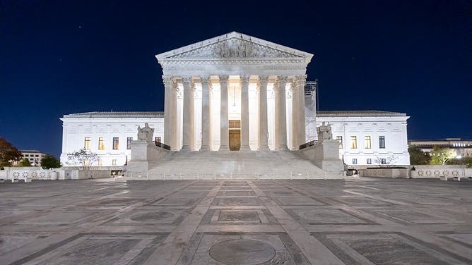 Night view of the Supreme Court of the United States known as SCOTUS in Washington D.C.The Main Entrance with lights, the West Facade with the marble Pediment and the inscription EQUAL JUSTICE UNDER LAW with the night sky and stars. The Supreme Court Building illuminated during the night. The historical building houses the Supreme Court of the United States, referred to as The Marble Palace, the building serves as the official workplace of the Chief Justice of the United States and the eight associate justices of the Supreme Court. Washington DC, USA on November 8, 2024 (Photo by Nicolas Economou/NurPhoto via Getty Images)