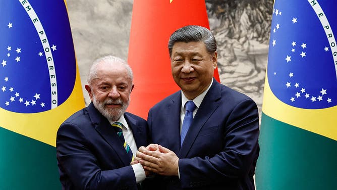 Chinese President Xi Jinping (R) shakes hands with Brazil's President Luiz Inacio Lula da Silva after a signing ceremony and a joint press conference, at the Great Hall of the People in Beijing on May 13, 2025. (Photo by TINGSHU WANG / POOL / AFP) (Photo by TINGSHU WANG/POOL/AFP via Getty Images)
