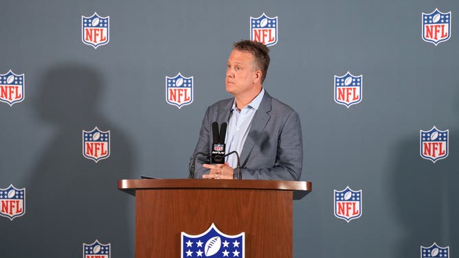 Mar 31, 2025; Palm Beach, FL, USA; Hans Schroeder, NFL Executive Vice President, Media Distribution gives a summary of issues during the NFL Annual League Meeting at The Breakers. Mandatory Credit: Jim Rassol-Imagn Images