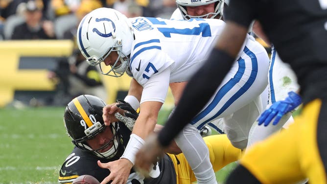 Nov 2, 2025; Pittsburgh, Pennsylvania, USA; Pittsburgh Steelers linebacker T.J. Watt (90) and Indianapolis Colts quarterback Daniel Jones (17) go for a loose ball during the first half at Acrisure Stadium. Mandatory Credit: Charles LeClaire-Imagn Images
