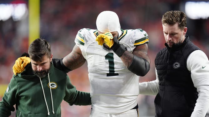 DENVER - Green Bay Packers defensive end Micah Parsons walks off the field with help from medical personnel following an injury during the third quarter against the Denver Broncos at Empower Field at Mile High on Dec. 14, 2025. Photo: Ron Chenoy-Imagn Images