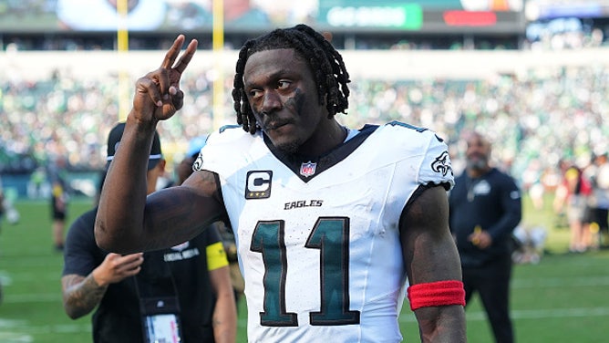PHILADELPHIA, PENNSYLVANIA - SEPTEMBER 21: A.J. Brown #11 of the Philadelphia Eagles reacts against the Los Angeles Rams at Lincoln Financial Field on September 21, 2025 in Philadelphia, United States. (Photo by Mitchell Leff/Getty Images)