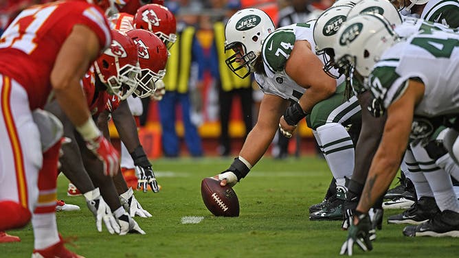 KANSAS CITY, MO - SEPTEMBER 25: Center Nick Mangold #74 of the New York Jets gets set to snap the ball against the Kansas City Chiefs during the second half on September 25, 2016 at Arrowhead Stadium in Kansas City, Missouri. (Photo by Peter G. Aiken/Getty Images)