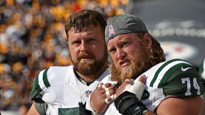 PITTSBURGH, PA - OCTOBER 09: Centers Nick Mangold #74 and Wesley Johnson #76 of the New York Jets look on from the sideline during a game against the Pittsburgh Steelers at Heinz Field on October 9, 2016 in Pittsburgh, Pennsylvania. The Steelers defeated the Jets 31-13. (Photo by George Gojkovich/Getty Images)