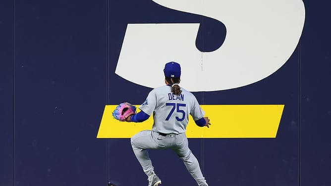 TORONTO, ONTARIO - OCTOBER 31: Justin Dean #75 of the Los Angeles Dodgers fields a ground-rule double hit by Addison Barger #47 of the Toronto Blue Jays during the ninth inning in game six of the 2025 World Series at Rogers Center on October 31, 2025 in Toronto, Ontario. (Photo by Gregory Shamus/Getty Images)