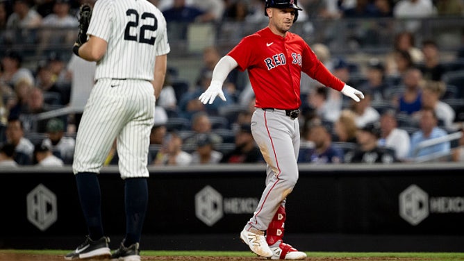 NEW YORK, NY - AUGUST 22: Alex Bregman #2 of the Boston Red Sox reacts after hitting a single during the third inning of a game against the New York Yankees on August 22, 2025 at Yankees Stadium in New York, New York. (Photo by Maddie Malhotra/Boston Red Sox/Getty Images)