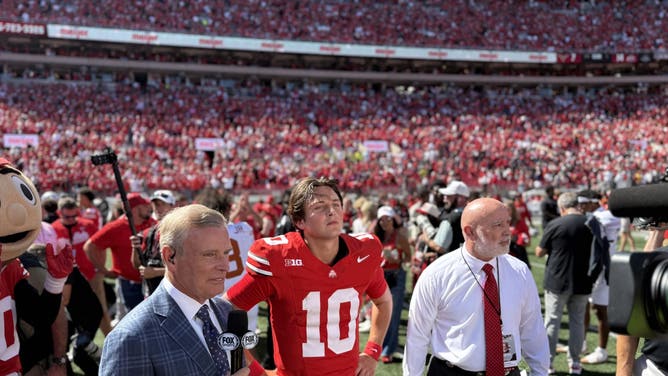 Ohio State's Julian Sayin readies for an interview following Ohio State's season-opening win over Texas. (Photo Credit: Trey Wallace/OutKick)