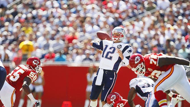 Football: New England Patriots QB Tom Brady (12) in action, making pass and receiving hit to left knee from Kansas City Chiefs Bernard Pollard (49). Brady sustained season-ending injuries with torn ACL and MCL during 1st quarter. Foxboro, MA 9/7/2008 CREDIT: Damian Strohmeyer (Photo by Damian Strohmeyer /Sports Illustrated via Getty Images) (Set Number: X80977 TK1 R4 F135 )