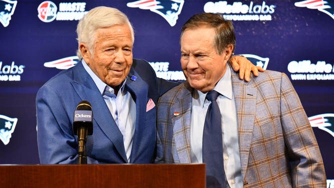 New England Patriots head coach Bill Belichick (R) and Patriots owner Robert Kraft speak to reporters where Belichick announced he is leaving the team during a press conference at Gillette Stadium in Foxborough, Massachusetts, on January 11, 2024. Belichick, the NFL mastermind who has guided the New England Patriots to a record six Super Bowl titles as head coach, is parting ways with the team after 24 seasons. (Photo by Joseph Prezioso / AFP) (Photo by JOSEPH PREZIOSO/AFP via Getty Images)