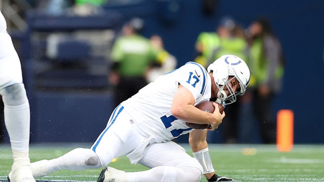 SEATTLE, WASHINGTON - DECEMBER 14: Philip Rivers #17 of the Indianapolis Colts gets tripped up against the Seattle Seahawks during the second quarter at Lumen Field on December 14, 2025 in Seattle, Washington. (Photo by Steph Chambers/Getty Images)