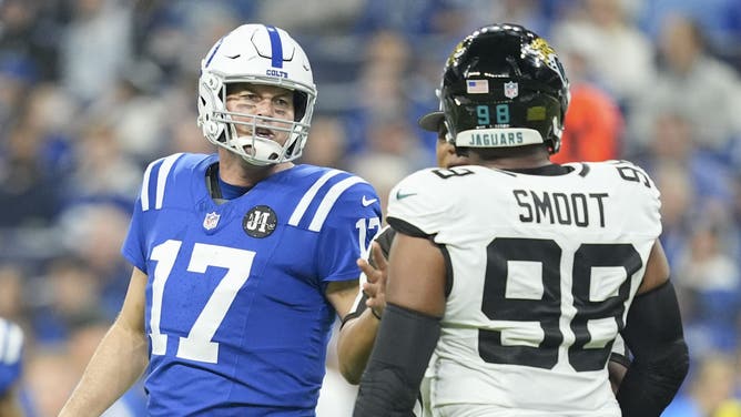 Indianapolis Colts quarterback Philip Rivers and Jacksonville Jaguars defensive end Dawuane Smoot exchange words during a game at Lucas Oil Stadium on Sunday in Dec. 28 in Indianapolis. Mandatory Credit: Mykal McEldowney-USA TODAY Network via Imagn Images