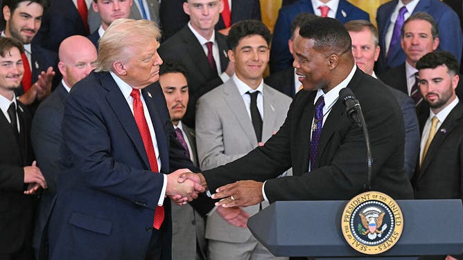 President Donald Trump shakes hands with Herschel Walker, former football player and US Ambassador to the Bahamas (R) at the White House in Washington, DC, on October 20, 2025. (Photo by SAUL LOEB / AFP) (Photo by SAUL LOEB/AFP via Getty Images)