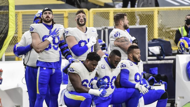 Jan 16, 2021; Green Bay, Wisconsin, USA; Los Angeles Rams players kneel during the National Anthem before game against the Green Bay Packers at Lambeau Field. Mandatory Credit: Benny Sieu-USA TODAY Sports