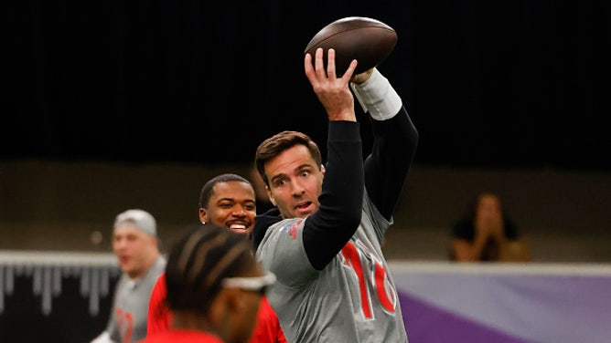 Joe Flacco catches a ball during AFC Pro Bowl practice at Moscone Center South in San Francisco, California Monday, Feb. 2, 2026 ahead of their game Tuesday, kicking off Super Bowl LX week in San Francisco. (Photo by Jessica Christian/San Francisco Chronicle via Getty Images)