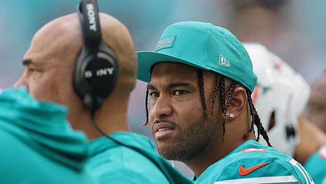 MIAMI GARDENS, FLORIDA - DECEMBER 21: Tua Tagovailoa #1 of the Miami Dolphins looks on from the sideline in the first quarter of a game against the Cincinnati Bengals at Hard Rock Stadium on December 21, 2025 in Miami Gardens, Florida. (Photo by Carmen Mandato/Getty Images)
