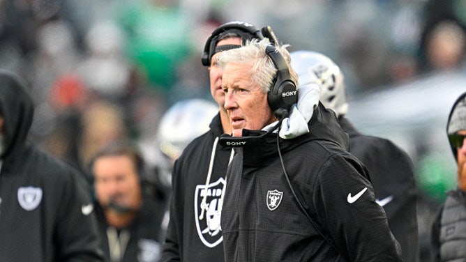 PHILADELPHIA, PENNSYLVANIA - DECEMBER 14: Head coach Pete Carroll of the Las Vegas Raiders looks on during warmups before the game against the Philadelphia Eagles at Lincoln Financial Field on December 14, 2025 in Philadelphia, Pennsylvania. (Photo by Mitchell Leff/Getty Images)