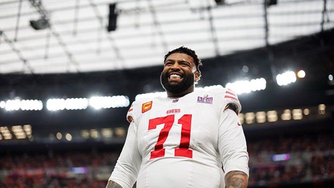 Trent Williams of the San Francisco 49ers looks on during pregame warmups before Super Bowl LVIII against the Kansas City Chiefs at Allegiant Stadium on February 11, 2024 in Las Vegas, Nevada. (Photo by Ryan Kang/Getty Images)