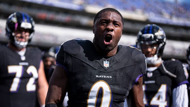 BALTIMORE, MARYLAND - OCTOBER 26: Roquan Smith #0 of the Baltimore Ravens reacts as he leads a huddle prior to an NFL football game against the Chicago Bears at M&T Bank Stadium on October 26, 2025 in Baltimore, Maryland. (Photo by Michael Owens/Getty Images)