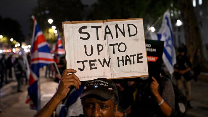 Protesters wave flags and hold placards during a demonstration organised by the Campaign Against Antisemitism outside Downing Street in London on October 9, 2025 to mark one week since the attack on a synagogue in Manchester. Jihad al-Shamie carried out a car and knife attack at the Heaton Park Hebrew Congregation Synagogue on October 3 which resulted in the deaths of two Jewish men, one likely from a stray police bullet, and several serious injuries. Shamie made an emergency call to police during the rampage to "pledge allegiance" to the Islamic State group, UK counter terrorism police revealed on October 8. Shamie was shot dead by police at the scene. (Photo by Chris J Ratcliffe / AFP) (Photo by CHRIS J RATCLIFFE/AFP via Getty Images)