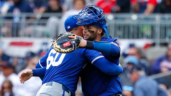 Lucas Erceg and Carter Jensen of the Kansas City Royals react following the Royals 4-1 victory over the Atlanta Braves at Truist Park on March 29, 2026, in Atlanta, Georgia. (Photo by Todd Kirkland/Getty Images)