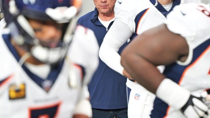 LAS VEGAS, NEVADA - JANUARY 7: Denver Broncos head coach Sean Payton, center, stands between Denver Broncos quarterback Russell Wilson (3), left, and Denver Broncos quarterback Jarrett Stidham (4), right, as the team comes out of the visiting tunnel before the game at Allegiant Stadium in Las Vegas, Nevada on January 7, 2024. The Las Vegas Raiders took on Denver Broncos during week 18 of NFL season. (Photo by RJ Sangosti/MediaNews Group/The Denver Post via Getty Images)