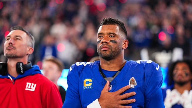 EAST RUTHERFORD, NJ - OCTOBER 09: RussellWilson #3 of the New York Giants looks on from the sideline during the national anthem prior to an NFL football game against the Philadelphia Eagles at MetLife Stadium on October 9, 2025 in East Rutherford, New Jersey. (Photo by Cooper Neill/Getty Images)