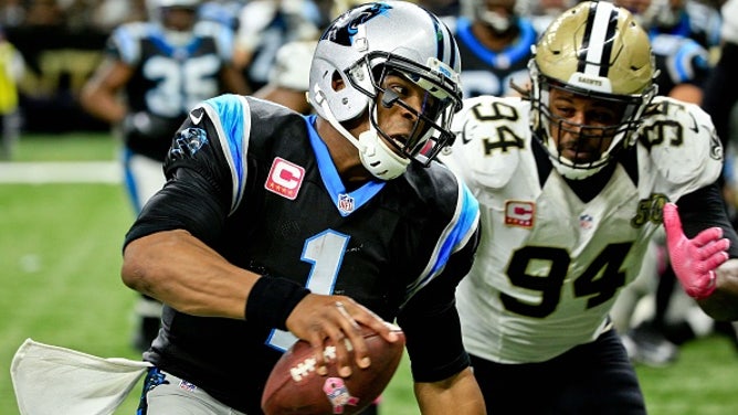Carolina Panthers quarterback Cam Newton (1) runs with the ball past New Orleans Saints defensive end Cameron Jordan (94) to score a touchdown during the fourth quarter at the Mercedes-Benz Superdome on October 16, 2016 in New Orleans, Louisiana. (Photo by Derick E. Hingle/Getty Images)