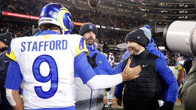 CHICAGO, ILLINOIS - JANUARY 18: (L-R) Matthew Stafford #9 embraces head coach Sean McVay of the Los Angeles Rams after the game against the Chicago Bears in the NFC Divisional Playoffs at Soldier Field on January 18, 2026 in Chicago, Illinois. (Photo by Michael Reaves/Getty Images)