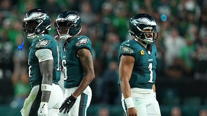PHILADELPHIA, PENNSYLVANIA - SEPTEMBER 04: A.J. Brown #11, DeVonta Smith #6, and Jalen Hurts #1 of the Philadelphia Eagles look on against the Dallas Cowboys at Lincoln Financial Field on September 04, 2025 in Philadelphia, Pennsylvania. (Photo by Mitchell Leff/Getty Images)