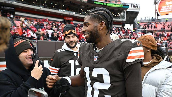 CLEVELAND, OHIO - NOVEMBER 30: Shedeur Sanders #12 of the Cleveland Browns interacts with fans before the game against the San Francisco 49ers at Huntington Bank Field on November 30, 2025 in Cleveland, Ohio. (Photo by Nick Cammett/Getty Images)