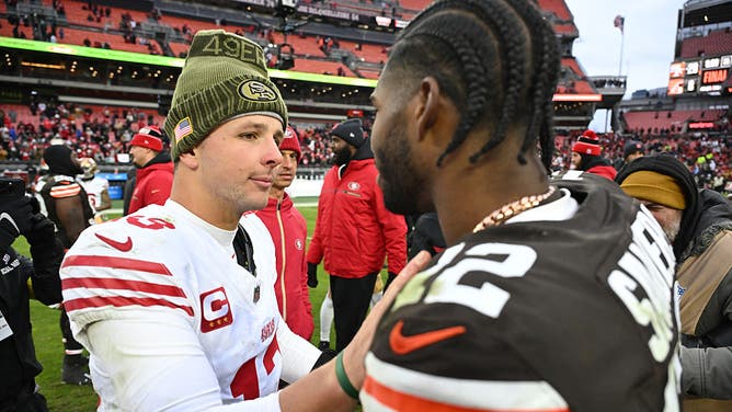 CLEVELAND, OHIO - NOVEMBER 30: Brock Purdy #13 of the San Francisco 49ers and Shedeur Sanders #12 of the Cleveland Browns shake hands following the game at Huntington Bank Field on November 30, 2025 in Cleveland, Ohio. (Photo by Nick Cammett/Getty Images)