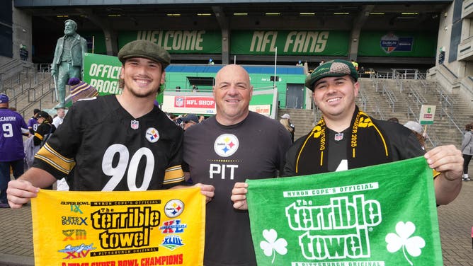 Sep 28, 2025; Dublin, Ireland; Pittsburgh Steelers fans pose with Terrible Towels during an NFL International Series game at Croke Park. Mandatory Credit: Kirby Lee-Imagn Images