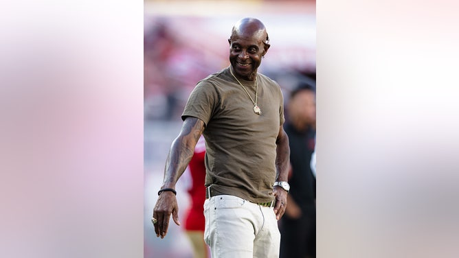 SANTA CLARA, CA - AUGUST 23: Jerry Rice stands on the San Francisco 49ers sideline before a preseason game between the Los Angeles Chargers and the San Francisco 49ers on Thursday, August 23, 2025 at Levi's Stadium in Santa Clara, California. (Photo by Trinity Machan/Icon Sportswire via Getty Images)