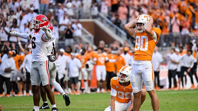 KNOXVILLE, TN - SEPTEMBER 13: Tennessee Volunteers place kicker Max Gilbert (90) reacts after missing a field goal during the college football game between the Tennessee Volunteers and the Georgia Bulldogs on September 13, 2025, at Neyland Stadium in Knoxville, TN. (Photo by Bryan Lynn/Icon Sportswire via Getty Images)