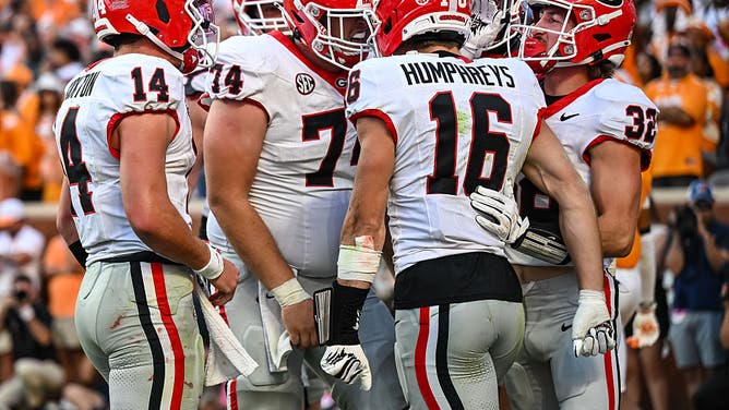 KNOXVILLE, TN - SEPTEMBER 13: Georgia Bulldogs wide receiver London Humphreys (16) celebrates with teammates after a touchdown catch during the college football game between the Tennessee Volunteers and the Georgia Bulldogs on September 13, 2025, at Neyland Stadium in Knoxville, TN. (Photo by Bryan Lynn/Icon Sportswire via Getty Images)