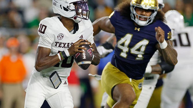 SOUTH BEND, IN - SEPTEMBER 13: Marcel Reed #10 of the Texas A&M Aggies looks to pass while pressured by Junior Tuihalamaka #44 of the Notre Dame Fighting Irish during a college football game on September 13, 2025 at Notre Dame Stadium in South Bend, Indiana. (Photo by Joe Robbins/Icon Sportswire via Getty Images)