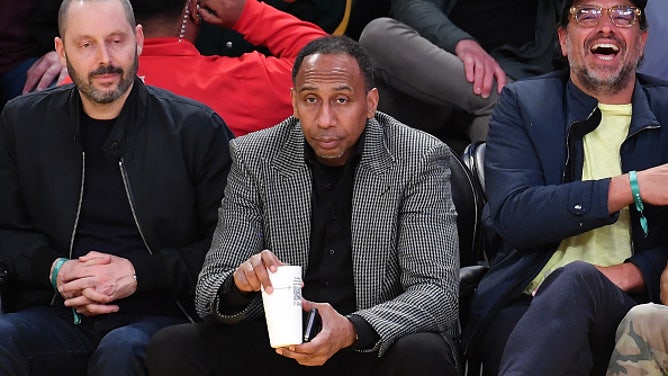 LOS ANGELES, CALIFORNIA - MARCH 06: Stephen A. Smith (C) attends a basketball game between the Los Angeles Lakers and the New York Knicks at Crypto.com Arena on March 06, 2025 in Los Angeles, California. (Photo by Allen Berezovsky/Getty Images)